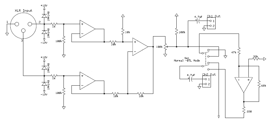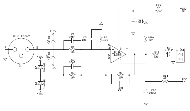 Como podrán notar usé uno único TL082, ya que tiene muy buena relación calidad/precio, y además le puse diodos de protección a la entrada del conector XLR.