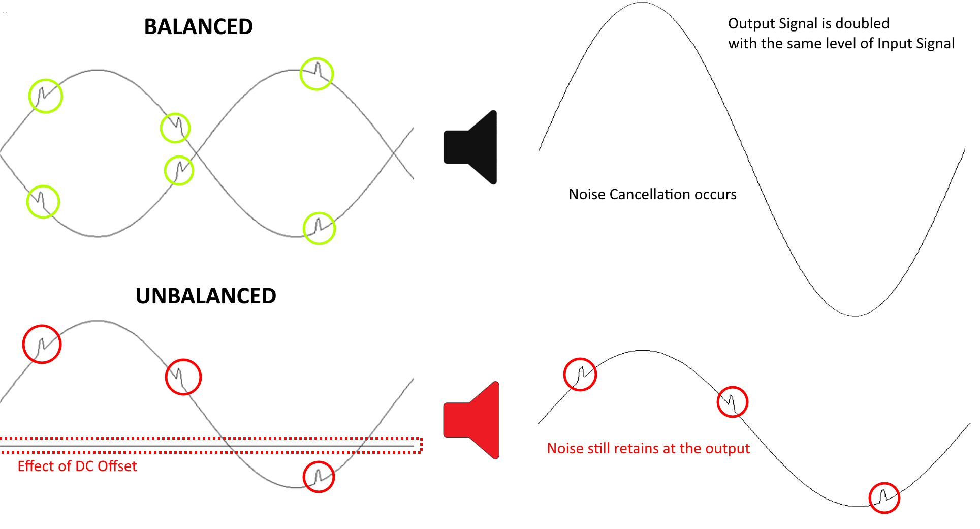En una línea equilibrada se realiza mediante dos conductores, uno de ellos denominado vivo o caliente el cual porta la señal en fase (normalmente de color rojo), el otro denominado retorno o frío porta la señal desfasada 180º llamada contrafase (normalmente de color negro). Este par de conductores va cubierto por una malla conectada a masa. Con esta disposición, se logra mejorar la respuesta ante las interferencias que ofrece la línea no balanceada de audio. La diferencia entre ambas es considerable, pudiendo llegar a los 80 dB (más cuando se trata de líneas microfónicas de alta calidad).