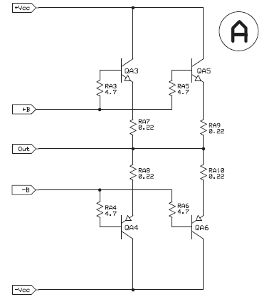 La etapa driver, esta basada en un par diferencial simétrico, desarrollado originalmente por Krell, aunque hay muchos fabricantes que usan entradas totalmente simétricas. Se implica que la simetría mejora el rendimiento, además, este tipo de configuración es muy estable en amplificadores de alta potencia. Los Q5, 6 conforman un par de fuentes de corriente constante para alimentar los pares diferenciales (Q1, 2, 3, 4), esto garantiza que los pares diferenciales estarán correctamente polarizados pese a las posibles variaciones que pueden haber en la fuente de poder. Los Q7, 8, 9, 10 son los espejos de corriente que evitan en gran medida que el amplificador entre en oscilación. La señal se amplifica en tensión a por medio de los Q13, 14, más cuentan con los Q11, 12 que actúan como limitadores de corriente, que evitan los posibles picos que puedan averiar los finales. La señal de audio se dirige hacia el circuito de compensación térmica (Q15 Bias) para controlar la corriente de reposo hacia los drivers Q16, Q17.